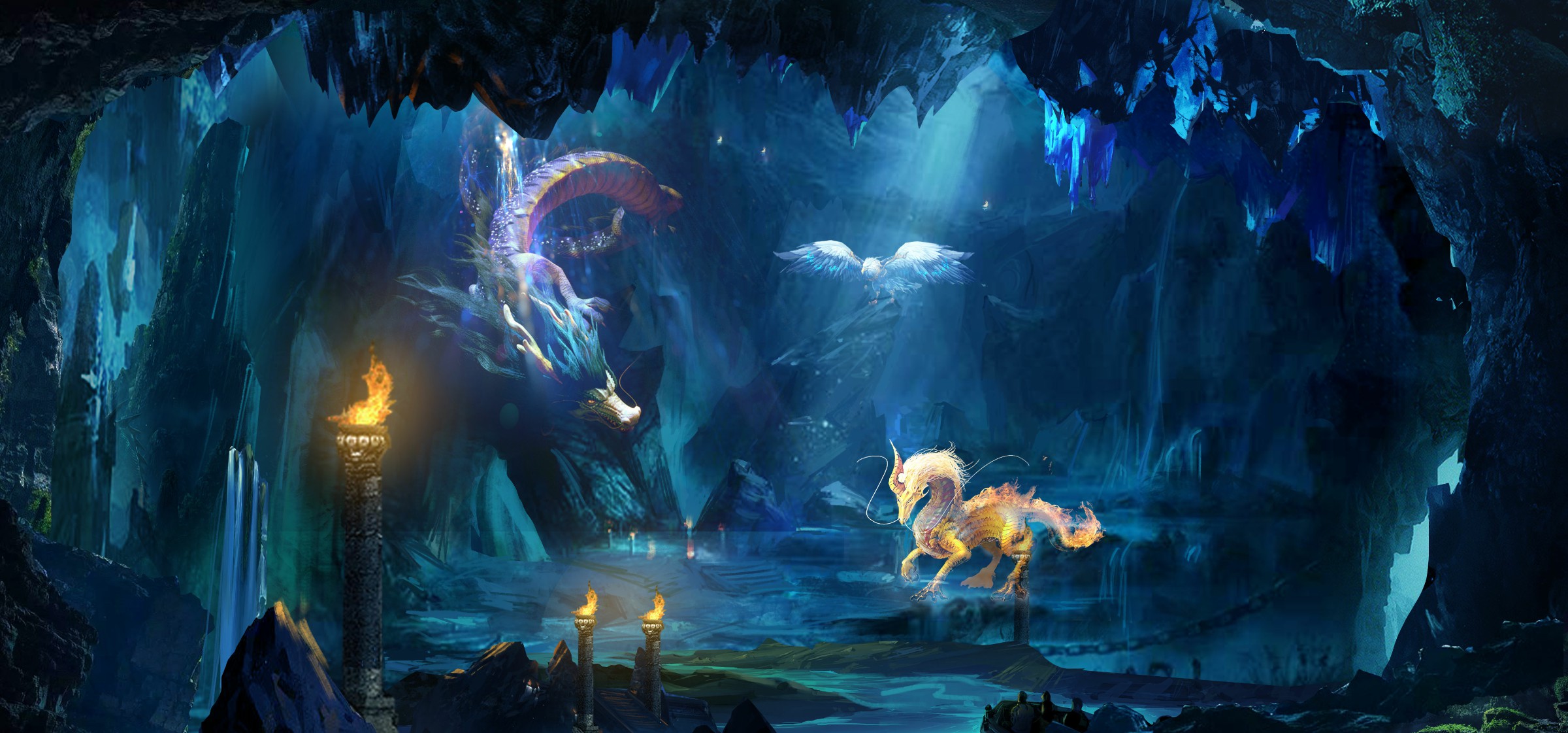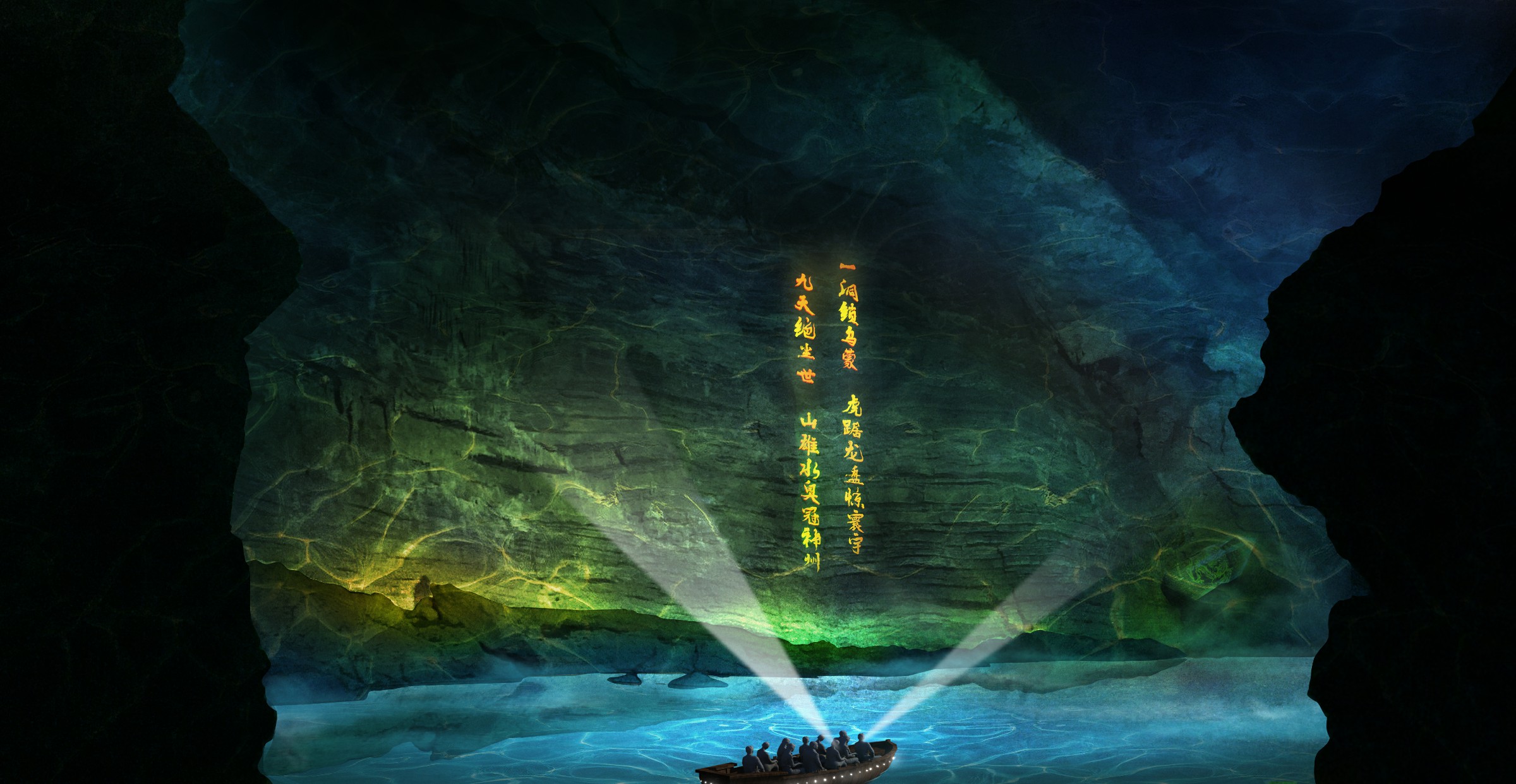 將“奇石傳說,秘境尋源” 這樣神秘的上古神話故事嵌入到九洞天天然的溶洞環境中,游客在游船過程中,置身于沉浸式的環境,感受神話的詭秘與探險的刺激。